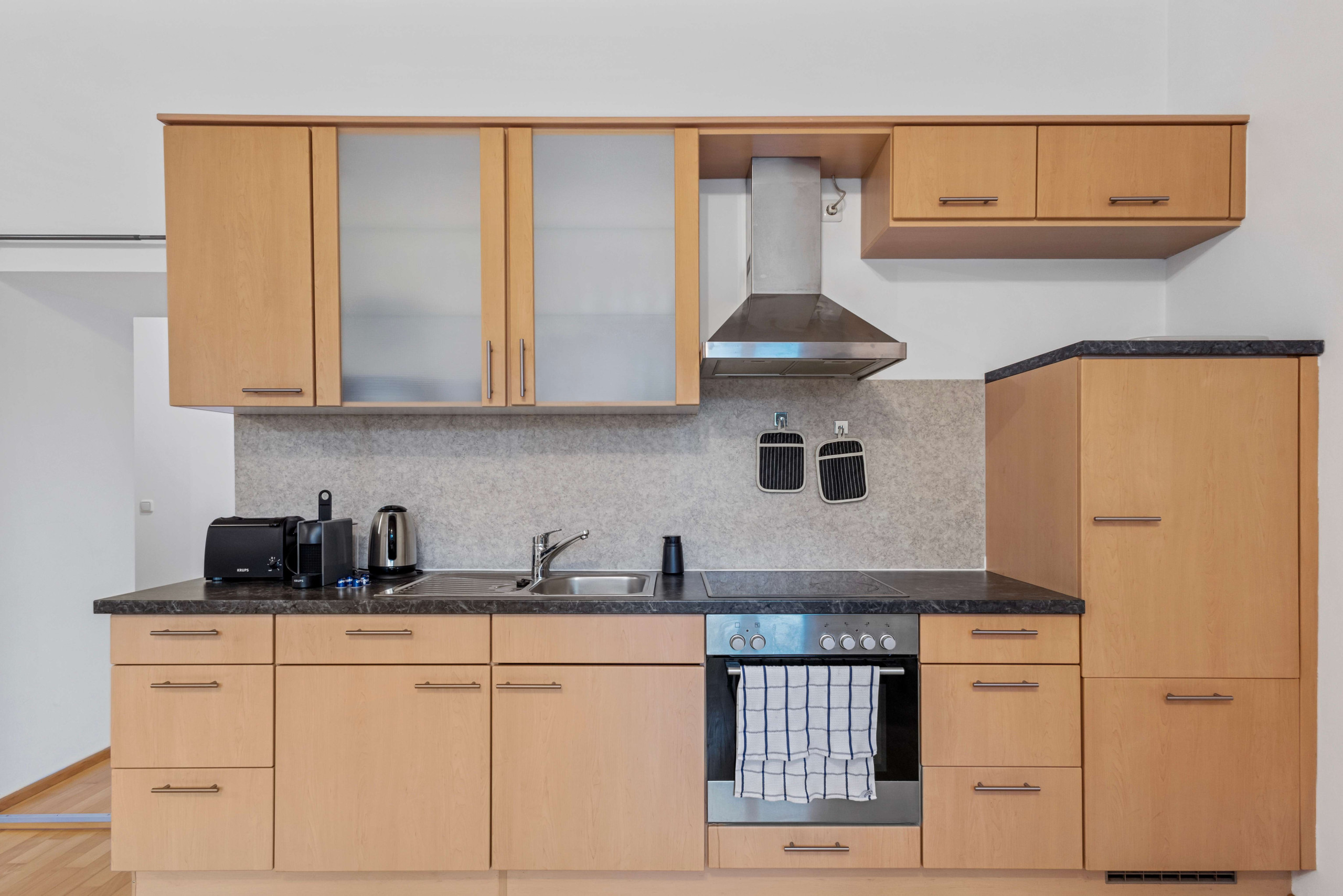 In the hotplate of glass ceramics open plan kitchen, refrigerator, oven, dishes/cutlery, kitchen utensils, coffee machine, toaster, kettle and hob are provided.