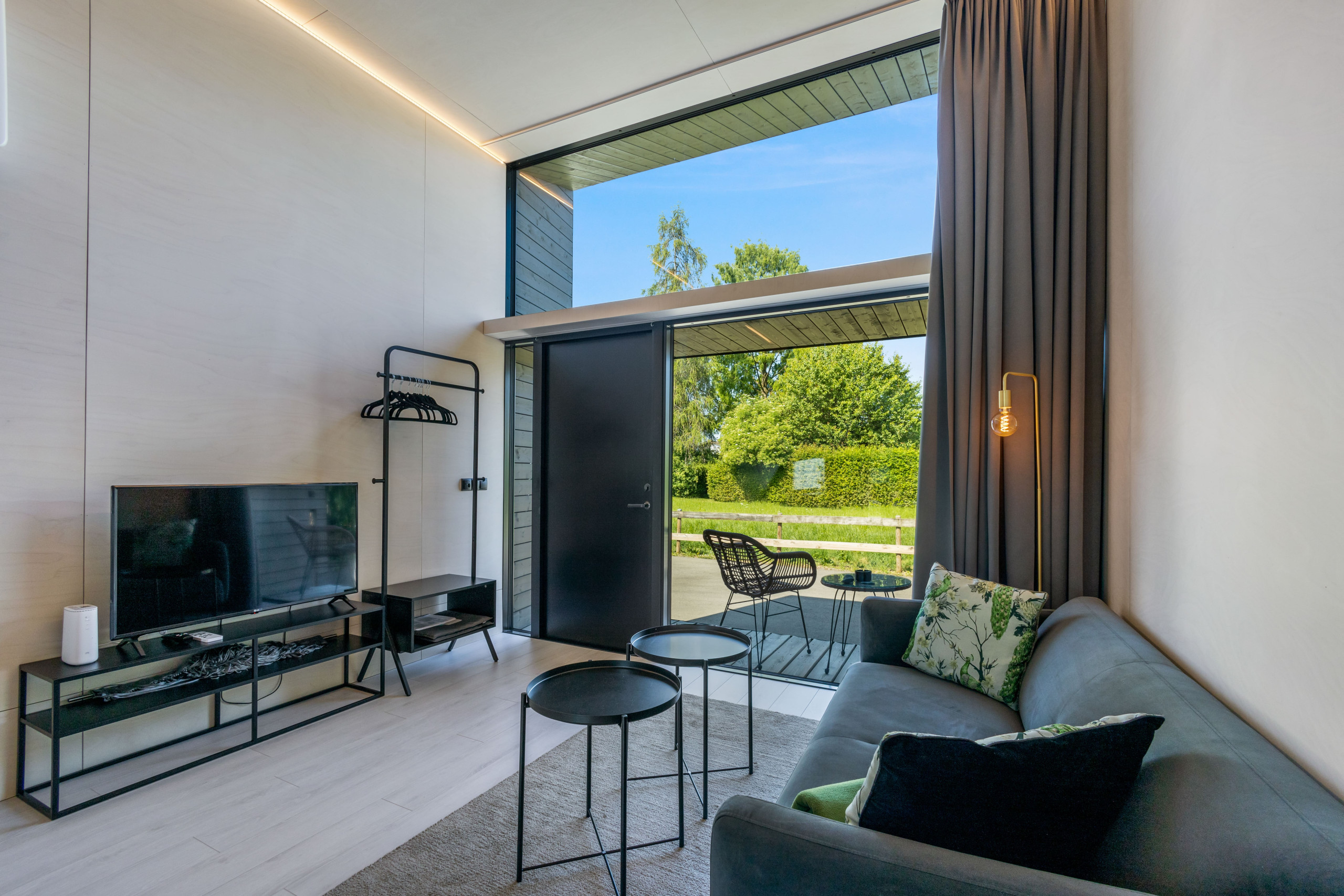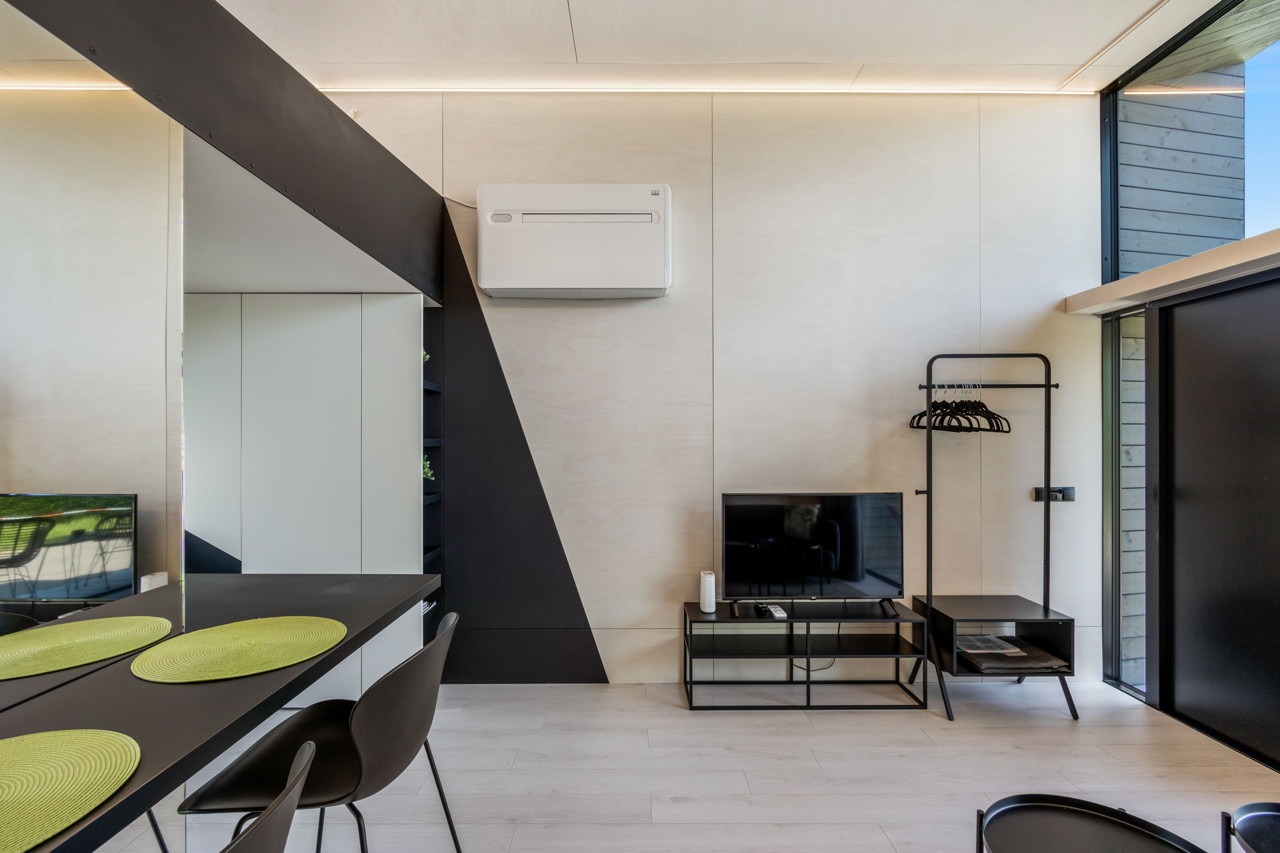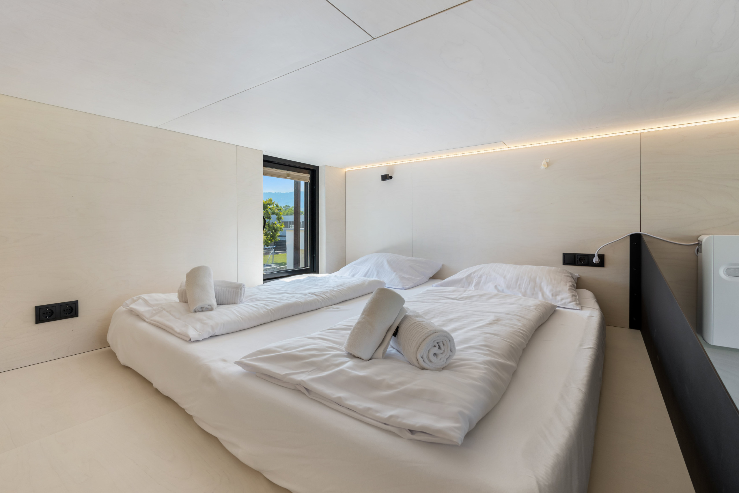 Der gemütliche Schlafbereich auf dem oberen Halbstock ist mit einer großzügigen 2x2 m Matratze ausgestattet – perfekt zum Ausruhen und Abschalten. Im Wohnbereich erwarten dich ein bequemes Sofa, WLAN und ein Smart-TV mit Simpli TV für entspannte Abende.