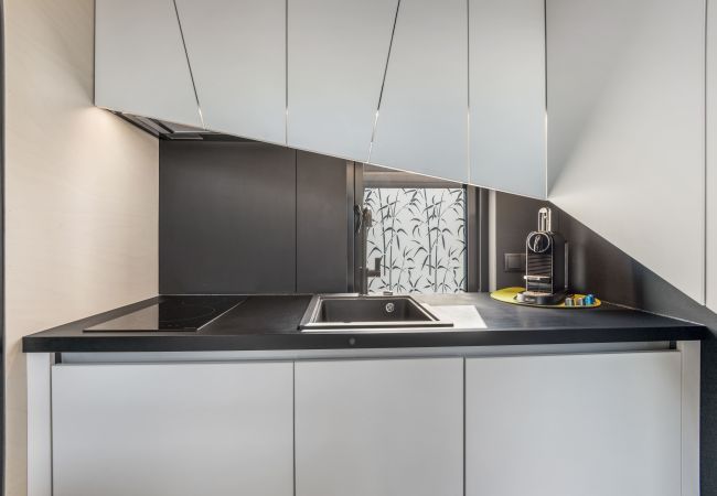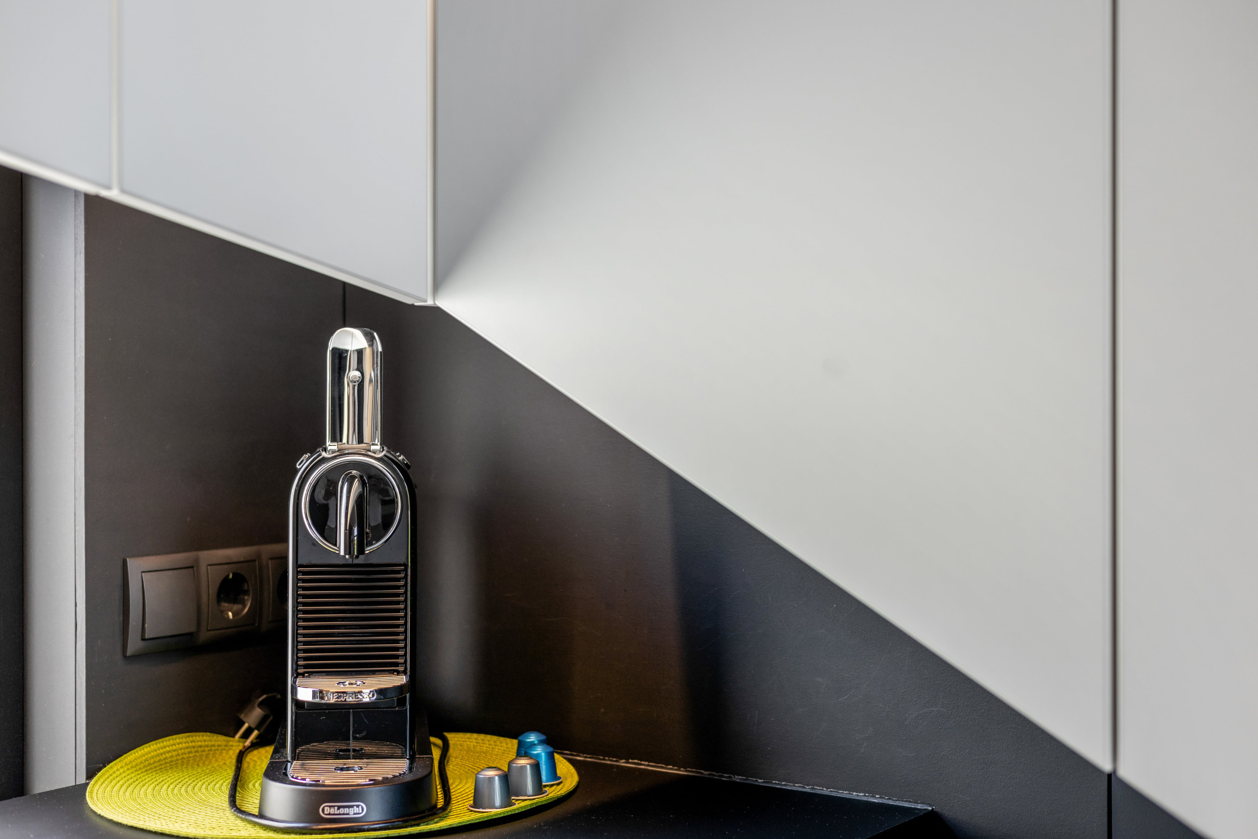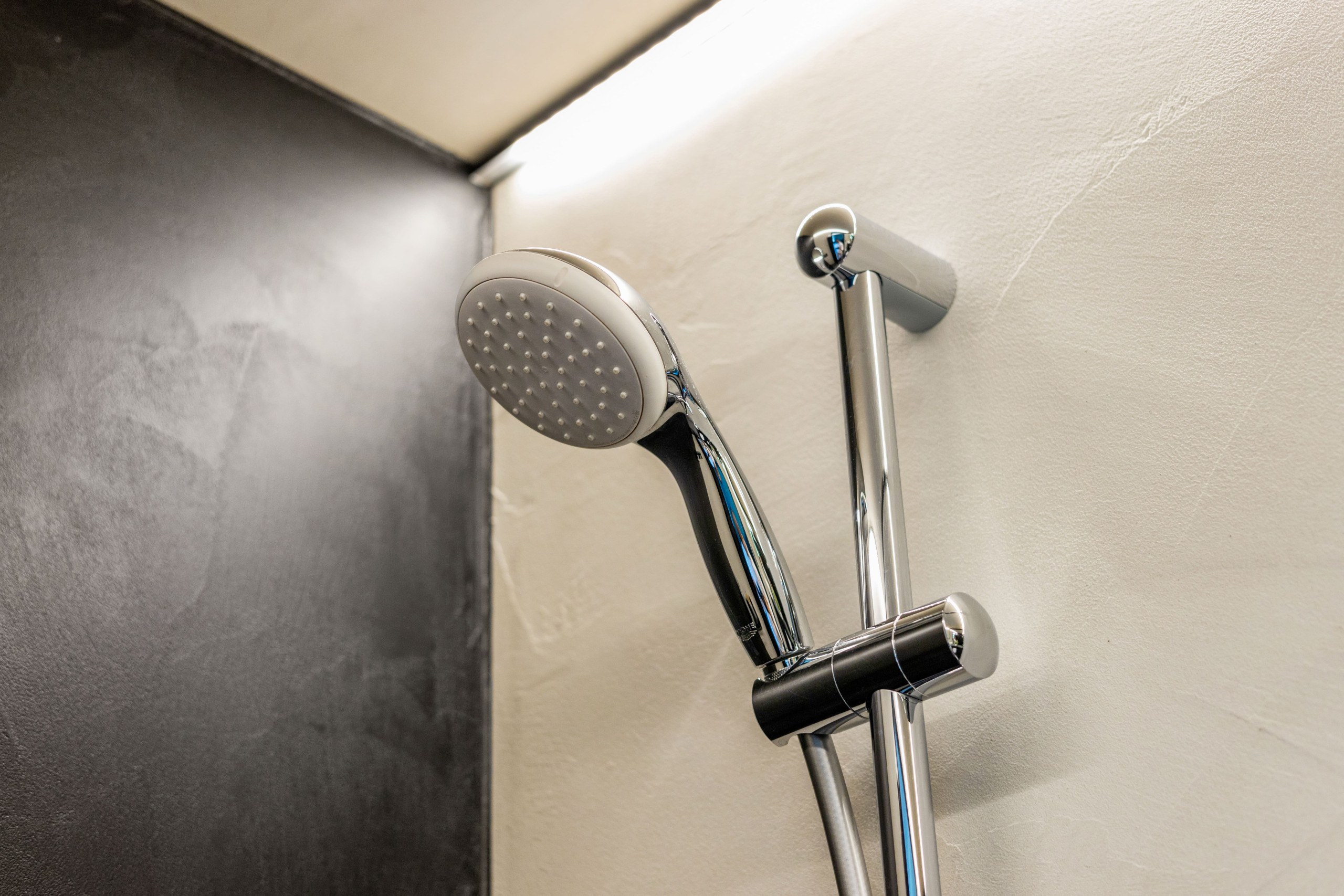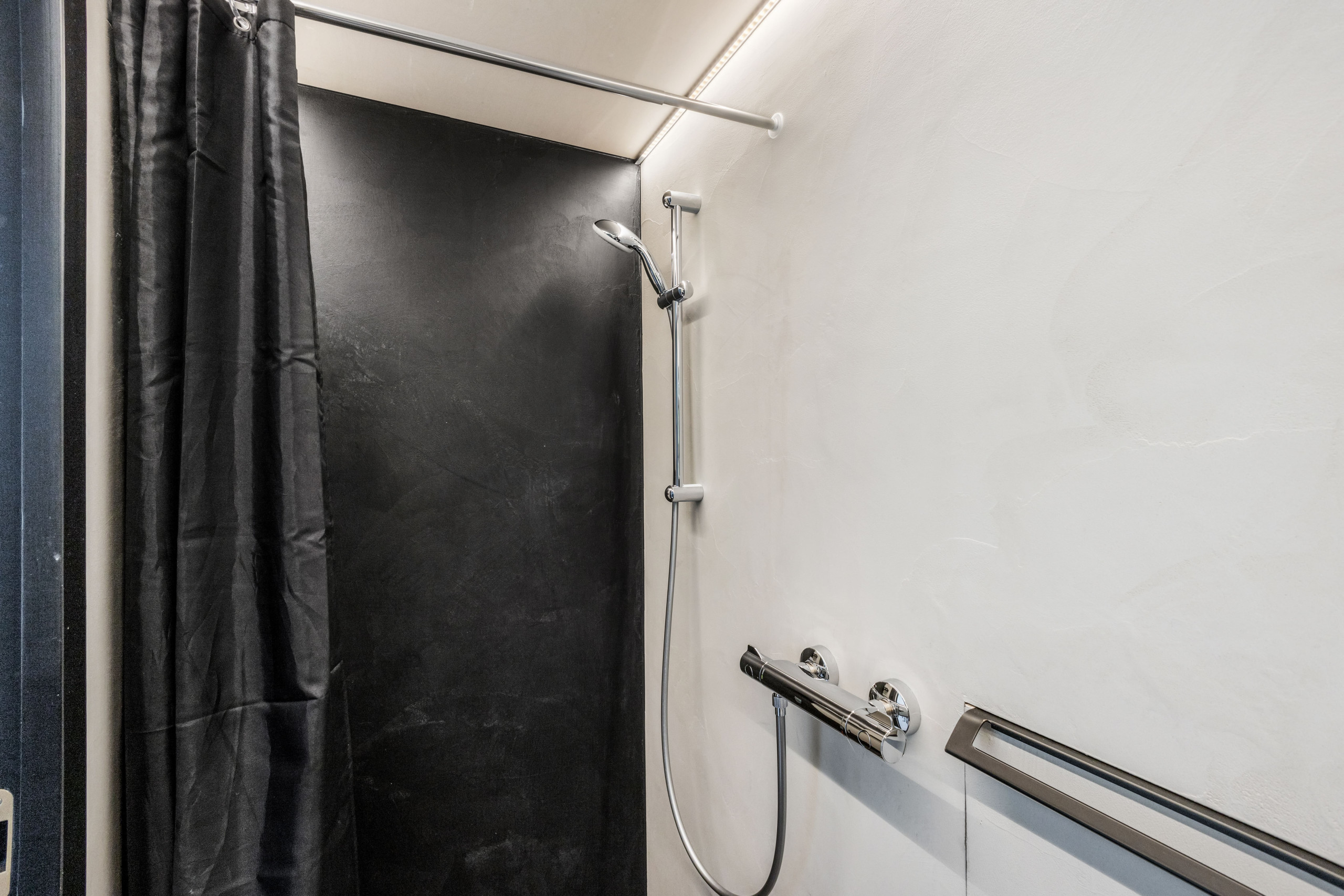 Die kompakte Küche ist funktional eingerichtet mit Herdplatte, Kaffeemaschine, Toaster, Wasserkocher, Geschirr sowie einer Waschmaschine – ideal für kurze wie längere Aufenthalte. Das Badezimmer verfügt über Dusche und WC; das Waschbecken befindet sich in der Küche.