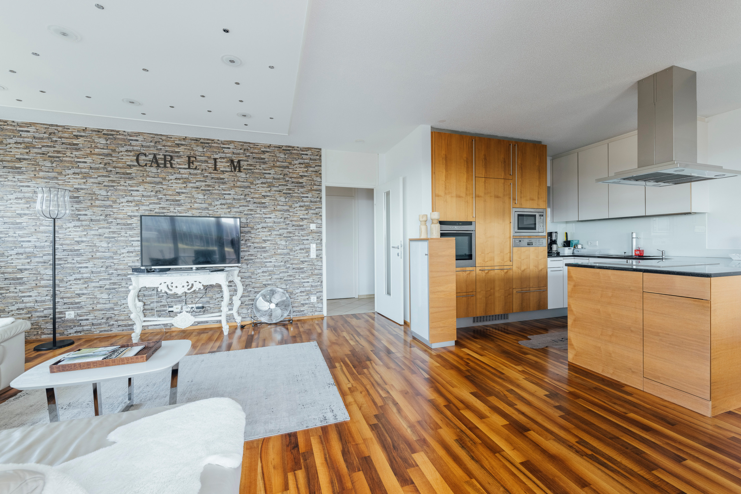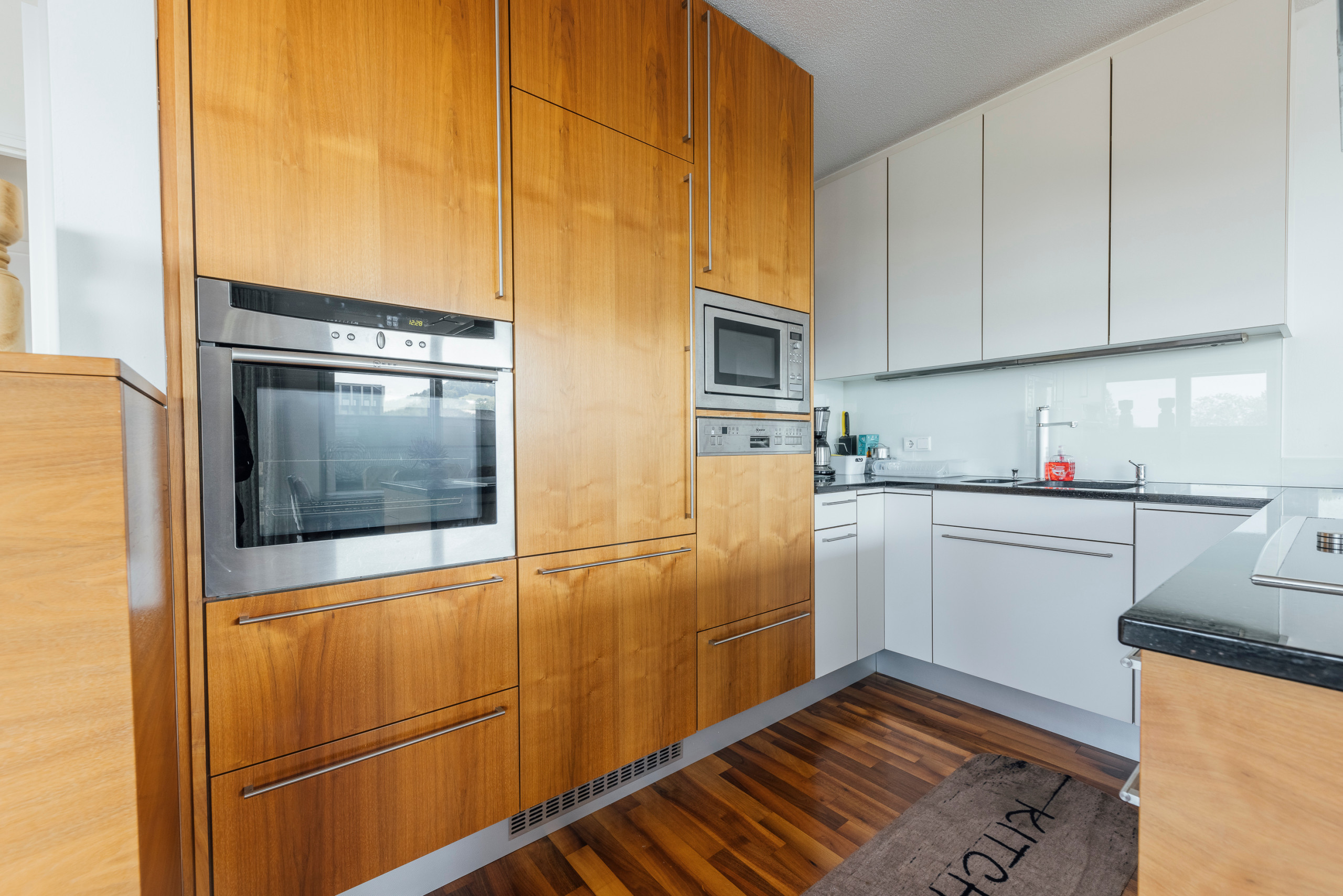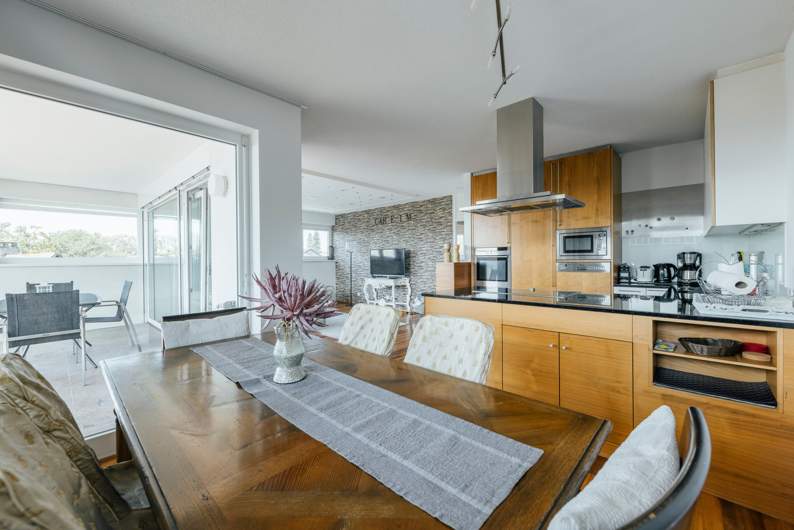 Die amerikanische Küche ist voll ausgestattet mit Induktionskochfeld, Kühlschrank, Gefrierfach, Backofen, Mikrowelle, Kaffeemaschine und Küchenutensilien.