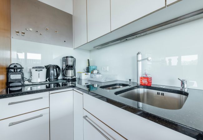 Die moderne offene Küche ist voll ausgestattet mit Kühlschrank, Backofen, Gefrierfach, Geschirrspüler, Geschirr/Besteck, Küchenutensilien, Kaffeemaschine, Toaster und Wasserkocher. -