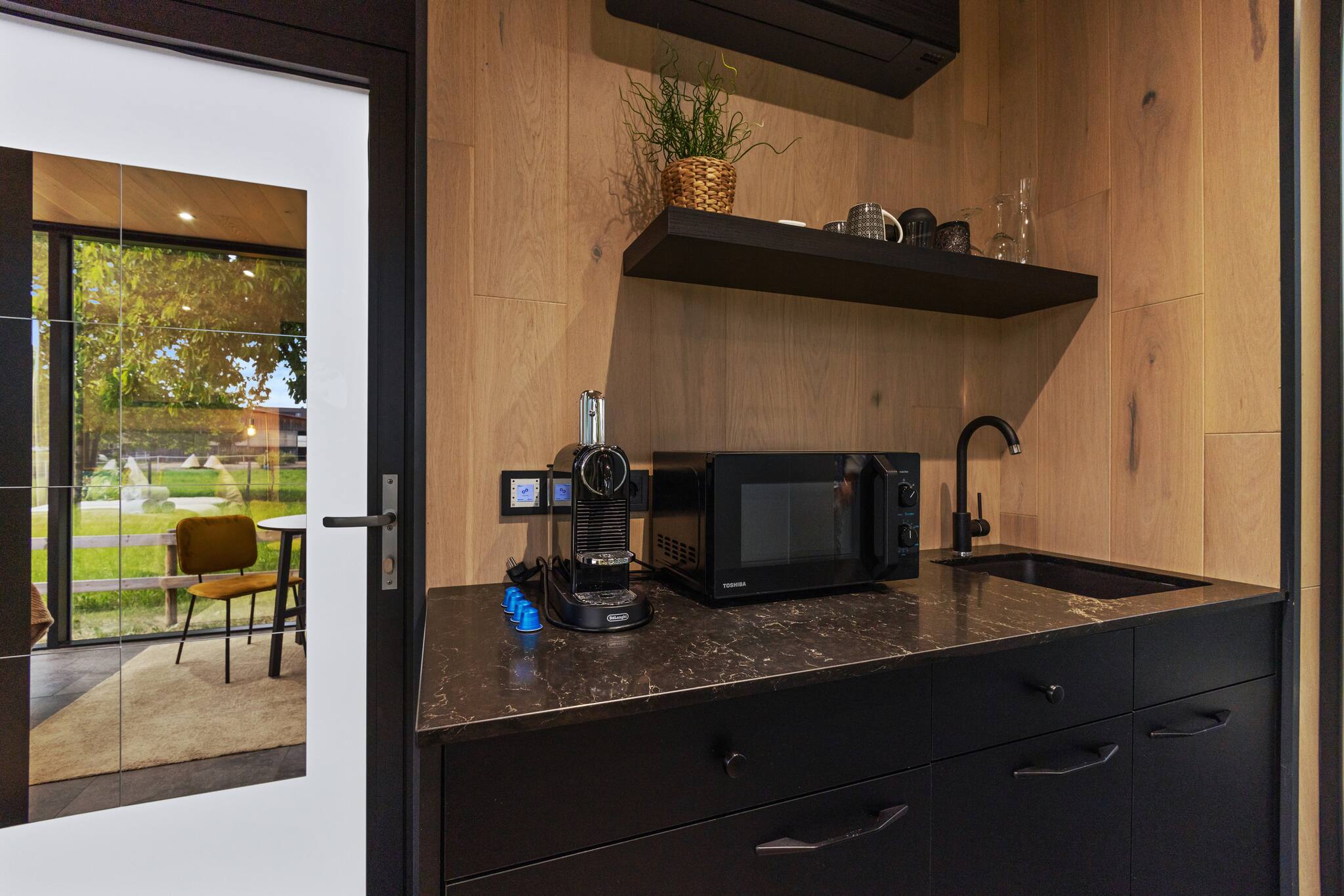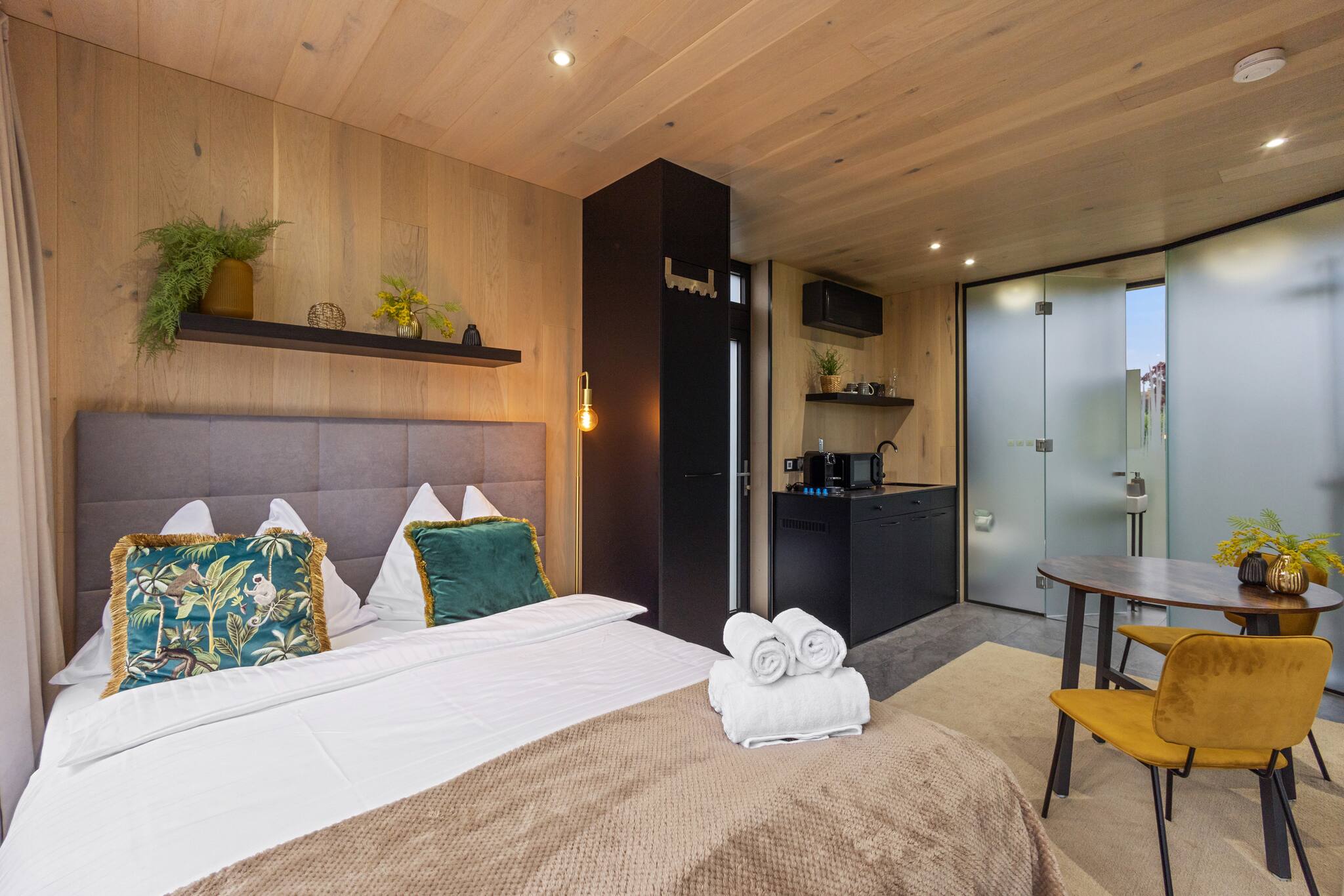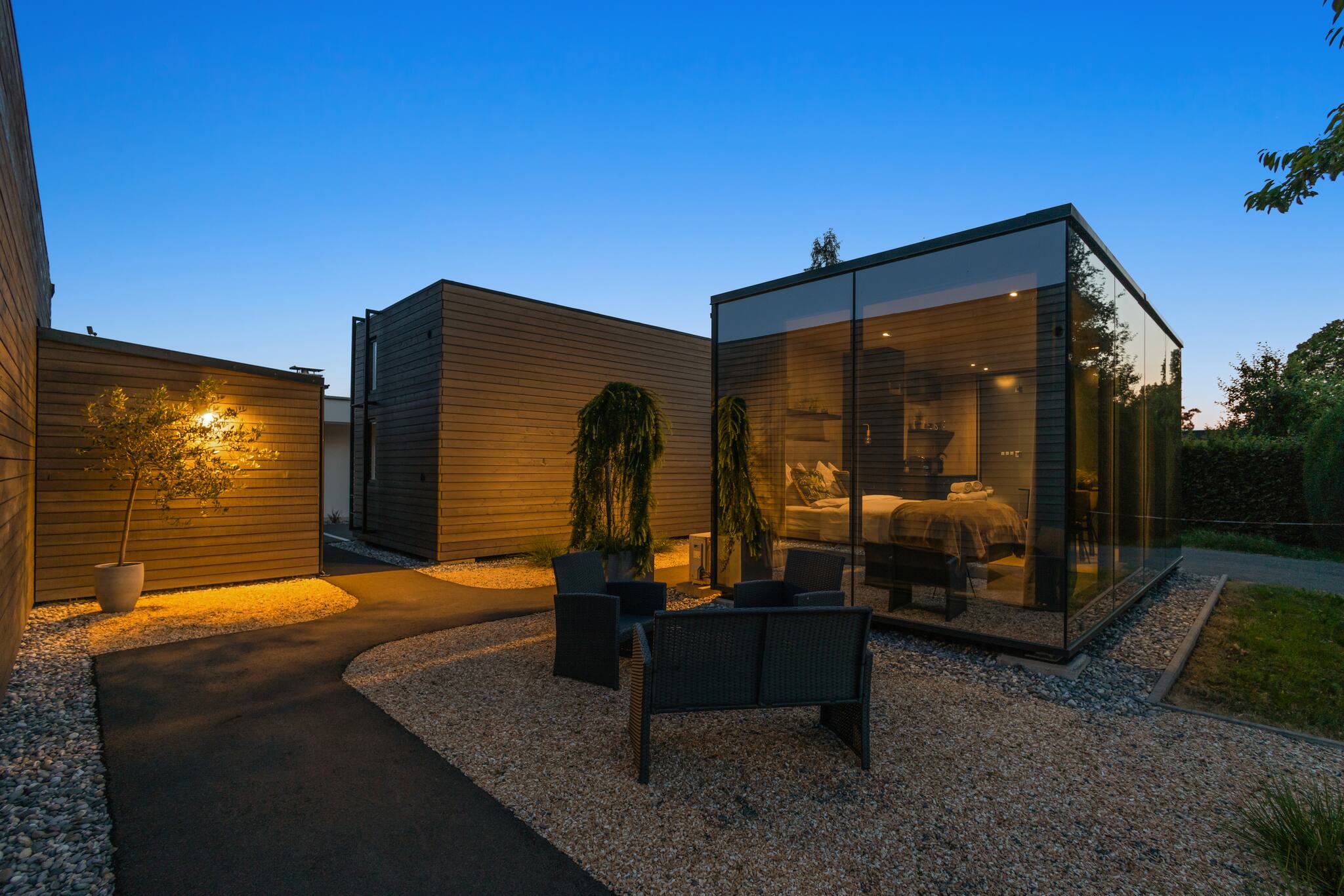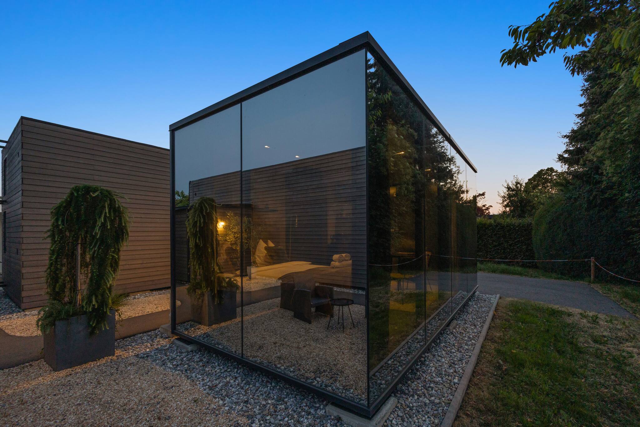 Erlebe außergewöhnliches Wohnen in einem verspiegelten Glasbau – tagsüber blickdicht und stilvoll. Dich erwarten ein gemütliches Doppelbett, eine gut ausgestattete Teeküche, modernes Bad, App-gesteuerte Beleuchtung, WLAN und ein kleiner Garten. Parkplatz direkt vor der Tür. Ideal für eine besondere Auszeit mit Wow-Effekt!